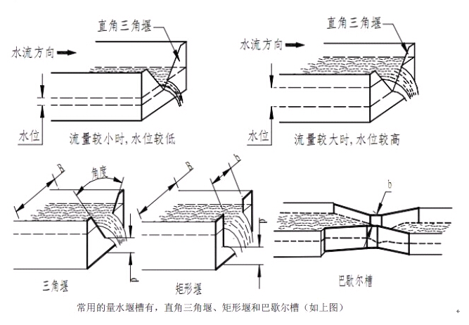 常用的量水堰槽有:三角堰、矩形堰和巴歇爾槽。